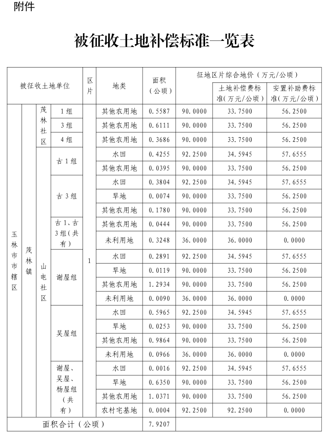 玉林市市辖区茂林镇茂林社区 1、3、4 居民小组,山电社区古1、古 3、吴屋、谢屋、杨屋居民小组,合计征地面积7.9207公顷(约 118.8105 亩)。