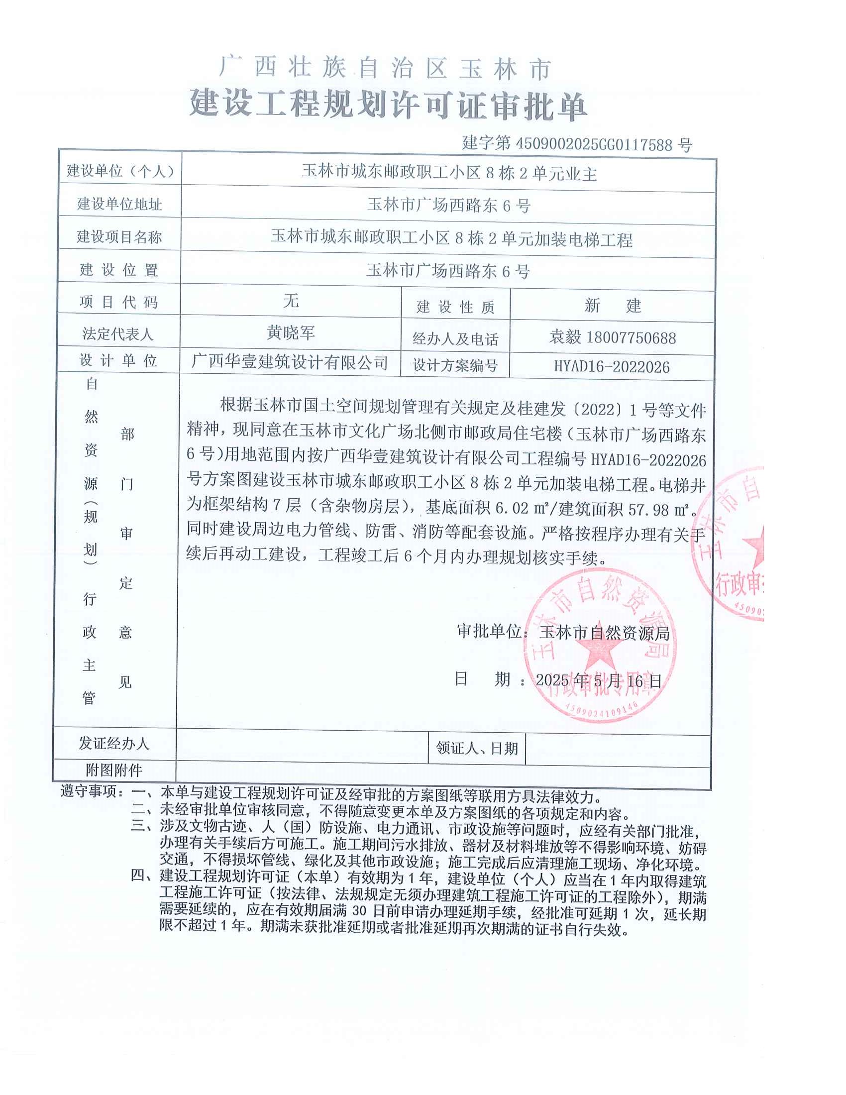 经核,我局于2025年5月16日核发的城东邮政职工小区8栋2单元加装电梯工程建字第4509002025GG0117588号建设工程规划许可证所附审批单中:“桂建发〔2018〕18号、玉住建管〔2020〕6号、桂建发〔2022〕1号等文件,经相关业主同意及经公示无异议后”的表述有误,现已更正,并公告。