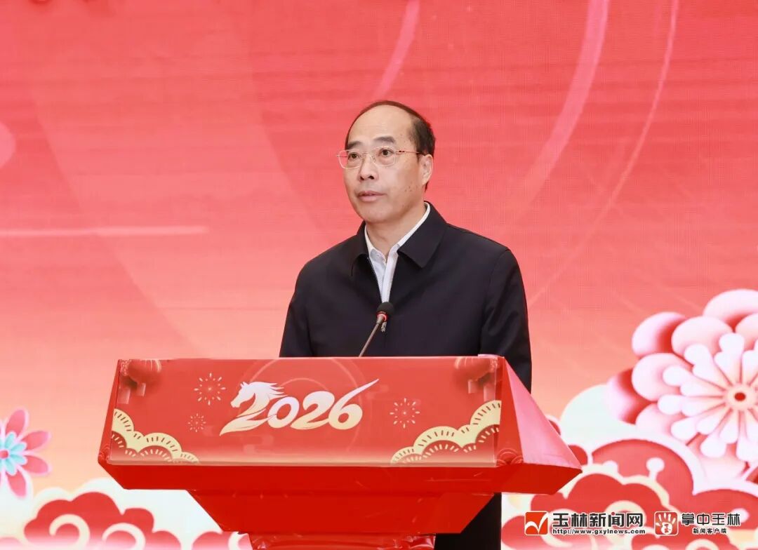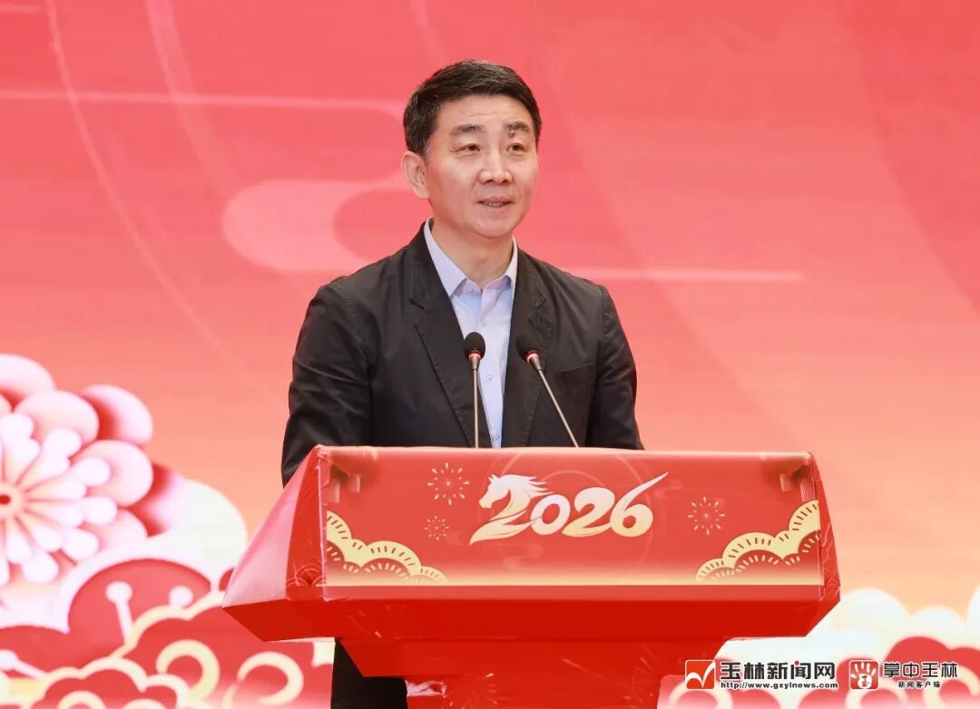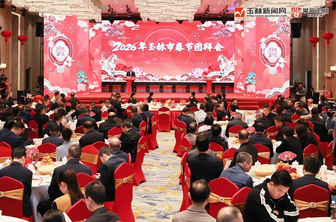 丙午马年春节即将到来,玉林大地处处洋溢着喜庆的节日气氛。2月13日,2026年玉林市春节团拜会在玉林城区举行,各界人士代表欢聚一堂、共迎新春。市委书记王琛出席团拜会并致辞,市长张惠强主持团拜会,市人大常委会主任李伟章、市政协主席吕剑枫、市委副书记邓国忠出席团拜会。2月13日,2026年玉林市春节团拜会在玉林城区举行,市委书记王琛出席团拜会并致辞。王琛代表市委、市人大常委会、市政府、市政协,向全市744万人民和广大党员干部,向驻玉部队指战员、武警官兵、公安民警和消防救援队伍指战员,向各位老领导、老同志,向所有关心、支持玉林建设发展的社会各界人士,向身在异乡打拼的玉林儿女,向220多万玉林籍海外华侨华人和港澳台同胞,致以新春祝福和节日问候。“2025年是玉林发展史上不平凡的一年、收获满满的一年。”王琛说,一年来,我们砥砺奋进,经济运行更为稳健,玉林已成为南方沿海新兴工业城市;向新而行,创新动能更为强劲,创新已成为玉林最鲜明的底色;全域向海,开放姿态更为豪迈,“联运河、织水网、建枢纽”新三件大事全面启动,玉商玉工回归屡掀热潮,营商环境持续优化;践行初心,民生改善更为可喜,“连心”工程扎实推进,文化塑城成果丰硕,群众安全感和满意度保持全区前列;强基固本,政治生态更为清朗,风气更正、人心更齐、干劲更足、业绩更好,每个人都在发光发热,每个人都值得点赞。“2026年是‘十五五’开局之年,也是玉林向新向优、赶超跨越的一年。”王琛说,我们要以“十虎竞玉林”为主抓手,打好“三大攻坚战”,实施“八个纵深推进”,以“变”开局、以“新”促进,加快建设清朗繁荣文明和谐美丽新玉林,奋力谱写中国式现代化玉林篇章。“今日之玉林,正迎来历史最好发展时期,高质量发展其时已至、其势渐成、其兴可待。”王琛说,让我们乘着马年的春风,坚持实干为要、创新为魂,用业绩说话、让人民评价,以万马奔腾的气势、快马加鞭的劲头,共同开创玉林更加灿烂辉煌的明天。“顺个事!”“大发大旺!”王琛用玉林话向大家致以新春祝福。与会人员一同观看了歌舞、情景剧、杂技等精彩的文艺演出。韦庆强、陈磊、司勇、何中奎、范小花、韦义、甘文波、张海鹏等市四家班子领导,玉林军分区大校政治委员,市检察院主要领导,玉柴集团有关领导,厅级离退休干部代表,各县(市、区)、各开发园区、市直机关各部委办局、各人民团体、各民主党派、各有关企事业单位和中直、区直驻玉各单位主要负责同志,以及社会各界代表等出席团拜会。