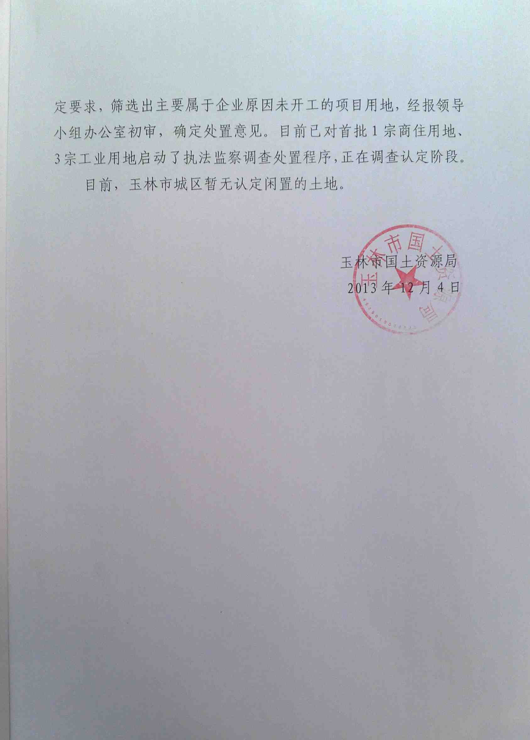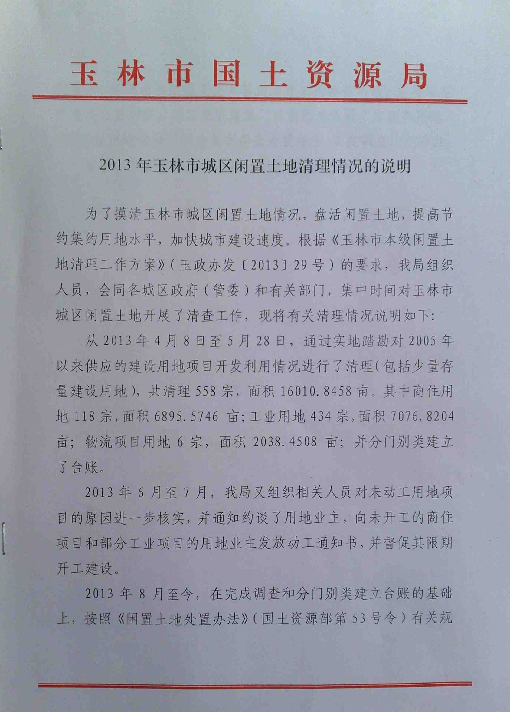 2013年玉林市城区闲置土地清理情况的说明